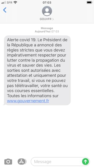 "3rd day of confinement: my wife is telling me to take a walk...she'll pay the fine."Of course these are early days. It will undoubtedly get harder to laugh the longer our confinement lasts. There's a gallows backdrop to every joke. It is easy at moments to be gripped by fear that the invisible enemy will make its way into your own lungs, or to be seized by panic at the economic pandemonium that every day spreads faster than the virus.