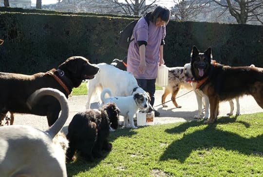 Tasha enduresDogs help you meet a fair sample of Homo Parisus. There are the people with whom you never get beyond a polite hello. There are the troubled ones you should have kept at a distance, the ones who start off with a perfectly nice puppy that they ruin by transferring their own problems onto the dog. And there are those who become friends, fixtures in your life: Nathaële (Youni, Colleen and Mousse), formerly an illustrator of children’s books, now a creator of animated videos; Nelly (Marou and Rêve) who actually worked for the Louvre, upon which the gardens depend, and who constantly defended canine rights for us within the administration; Stéphane (Urfée and Belle), a physical therapist; most recently Juan (Hope), a Cuban-American former antique dealer. And of course Koffi and Virginie (behind Tasha in the above photo), who saved our neurotic rescue dog and my sanity.