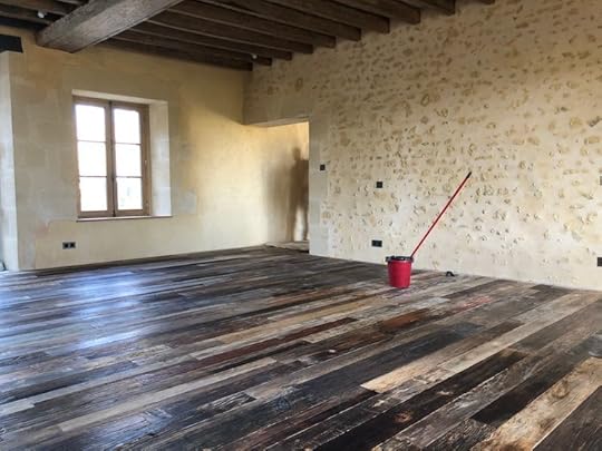 By the time the movers were ready to attack the ground floor, the protective plastic sheet covering the parquet, which had been laid once the cement finally dried during our London sojourn, had just been stripped away. Frustration at deficiencies and obstacles melted into awe at the sight of the Perche limestone walls meeting the reclaimed elm wooden floor. Here was the reason we were putting ourselves through all this bother.