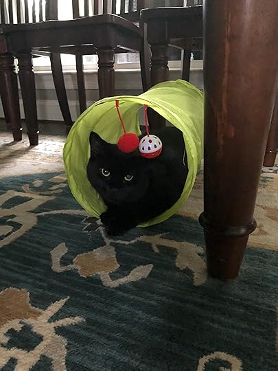 Lucas, our black barn cat, is back outside and has changed from winter roley poley, to fit and trim wild cat. Of course, when it rains, he likes to be inside, and I think he gave me one of his rare smiles.