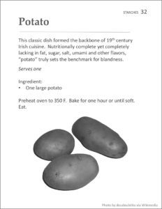 To research The Bland Food Cookbook, I scoured dozens of 19th and 20th century cookbooks from the British Isles, selecting only the very blandest recipes. Offering 53 recipes in stunning black-and-white print, The Bland Food Cookbook includes such classics as “potato”– a dish perfected in 19th century Ireland: