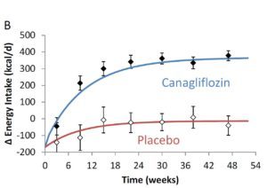 Using previously validated mathematical models, and measured body weight changes, Hall’s team estimated the calorie intake of the canagliflozin and placebo groups over the course of the one-year trial. They then used the resulting output to estimate how calorie intake, calorie expenditure, and the drive to eat change with typical weight loss, using two years of data from a commercial weight loss program (Weight Watchers).