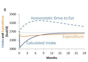 Plugging these numbers into Hall’s model, they estimate that the initial calorie deficit was about 700 Calories per day, but that this rapidly rebounded, and had almost returned to baseline by 9 months. This might suggest that the participants just stopped trying, but in fact this is unlikely to be the case, because they were still weight reduced at that point and therefore their brains were still experiencing a heightened drive to eat (see the line below labeled “homeostatic drive to eat”).