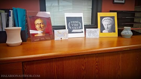 Since I'm such a Roman history buff, I couldn't help but decorate a small area in my office dedicated to the most impressive Empire (in my opinion) in history. The framed photos are: Julius Caesar, a map of the Roman Empire during the reign of Caesar Augustus, Julius Caesar's epic proclamation to the Senate of Veni Vidi Vici (I came, I saw, I conquered - roughly), a map of the center of Rome during the reign of Caesar Augustus, and, of course, Caesar Augustus himself.
