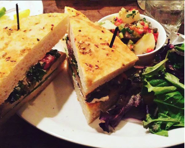 I didn't return until January of 2016 when my husband and I went for our 10th Anniversary. We started off with the house Red Pepper Hummus with crudite, which I get almost every time now as it's the best hummus I've ever had, and the crudites are lightly seared tri-color peppers, carrots, and radishes. MMM mmm. This time around I had the Applewood-Smoked Tofu on homemade focaccia, potato salad, and greens with a tomato viniagrette. That smoked tofu was heaven sandwiched between two flavorful pillows. I wasn't as fond of the potato salad because I prefer mine fairly plain, but it was still tasty, and the vinaigrette made that whole salad. After that experience, I tried making smoked tofu myself with great success. I scored some ciabatta rolls and a bottle of muffaletta salad at Aldi around that time and made bomb sandwiches with the tofu.