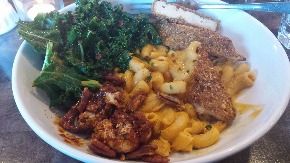 Not wanting to wait as long the next time, I went again in February of 2016. I ordered the Mac 'n Shews - a wonderful mac 'n cheese made with cashew cheese - that was served with Pecan-Encrusted Tofu, bbq cauliflower, and dressed greens. Not shown: Cashew Rangoon with Spicy Apricot dipping sauce. This meal was delicious, homey but swanky, and again I copied the dish, only this time with the cauli. My favorite item this evening, however, was the Cashew Rangoon. It tasted so much like the real deal that I wondered if I was getting tricked.