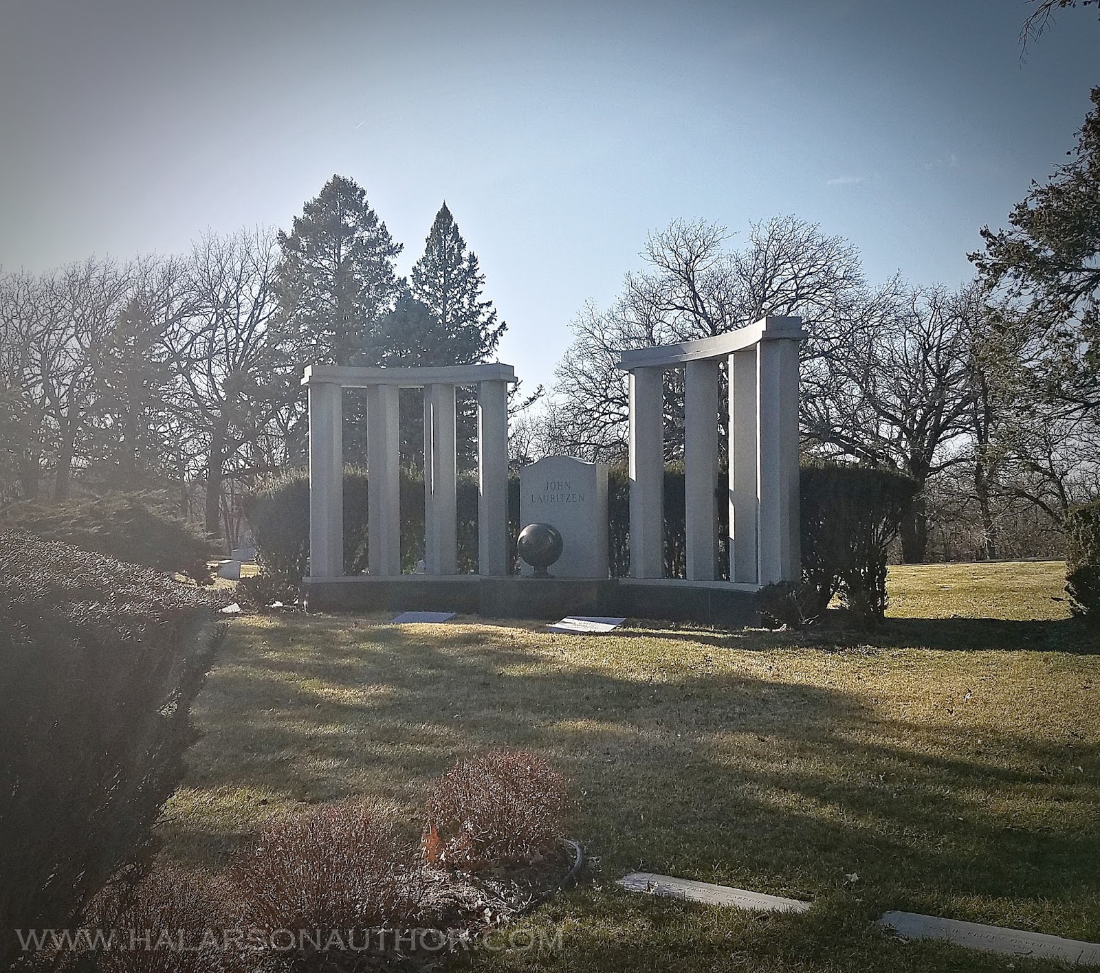 Exquisite plot marker for John R. Lauritzen family.This plot marker for John and Elizabeth Lauritzen is a nod to Greek architecture. John Lauritzen was the founder of Lauritzen Corporation, a bank holding company that has a large stake in First National Bank. He and his wife were philanthropists as well, and Lauritzen Gardens are named after him.