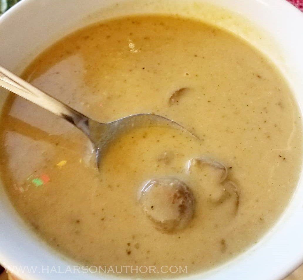 8 ounces white button mushrooms, sliced1/3 cup olive oil (If you're eating a lower-fat diet, drop this down to 1 T.)1 head of cauliflower, cut up into chunks4 cups vegetable stock1/4 cup coconut flour*2 cups water2 T nutritional yeast (can omit)1 tablespoon red pepper flakes or 1 teaspoon cayenne pepper (optional)1 teaspoon each: Old Bay seasoning (optional), garlic powder, onion powder, paprika, and turmeric2 teaspoons each Italian seasoning and ground pepper2 teaspoons hot Madras curry or regular curry**1 can coconut milksalt to taste***