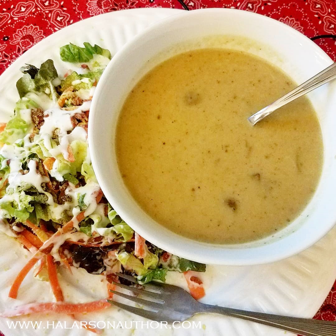 The secret to making the cream in this recipe is cauliflower. Yep, good old cauliflower. The cauliflower is cooked soft and blended to make a "cream". I love this soup and I'll definitely be making it again. It's easy to make, vegan, delicious, and low-carb...how can you go wrong? I served it with a simple salad on the side, but a nice piece of crusty bread would go perfect as well. Mmmm.