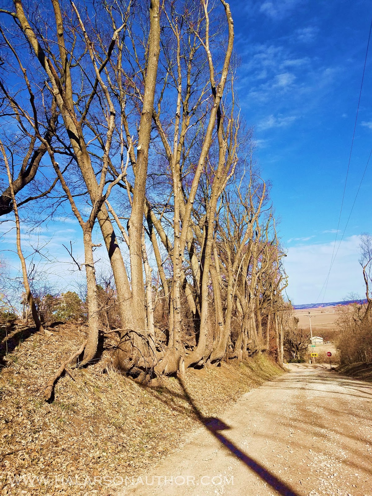 Tree roots make for an interesting road border.This is a road that meanders through the Hills, and, again, you can just see the Iowa Mountains in the background, off in the distance.