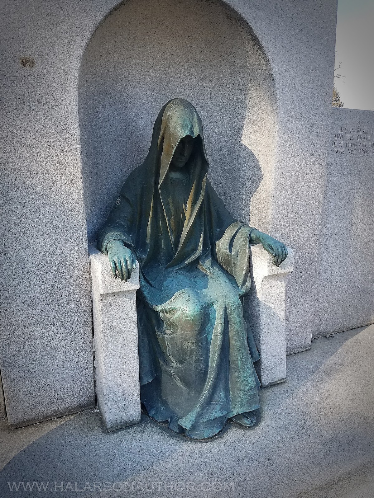 This is one of the most famous graves in Forest Lawn Cemetery, primarily for its interesting bronze statue. Josiah Wasserburger was the manager of the Omaha Loan Company who also invested heavily in real estate and made quite a bit of money. He and his wife, Alma, purchased this grave marker eighteen years before their death (and during the Depression no less) from J.F. Bloom & Co. The monument had sat, unpurchased, for five years until the Wasserburgers bought it, and it cost roughly $60,000.00 in today's money.