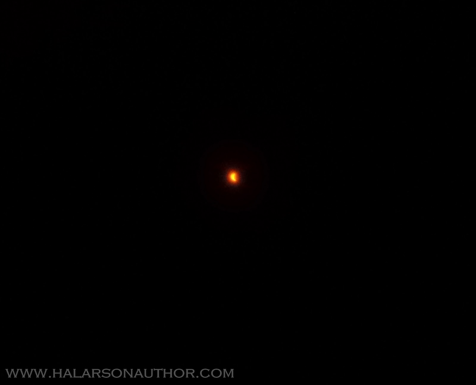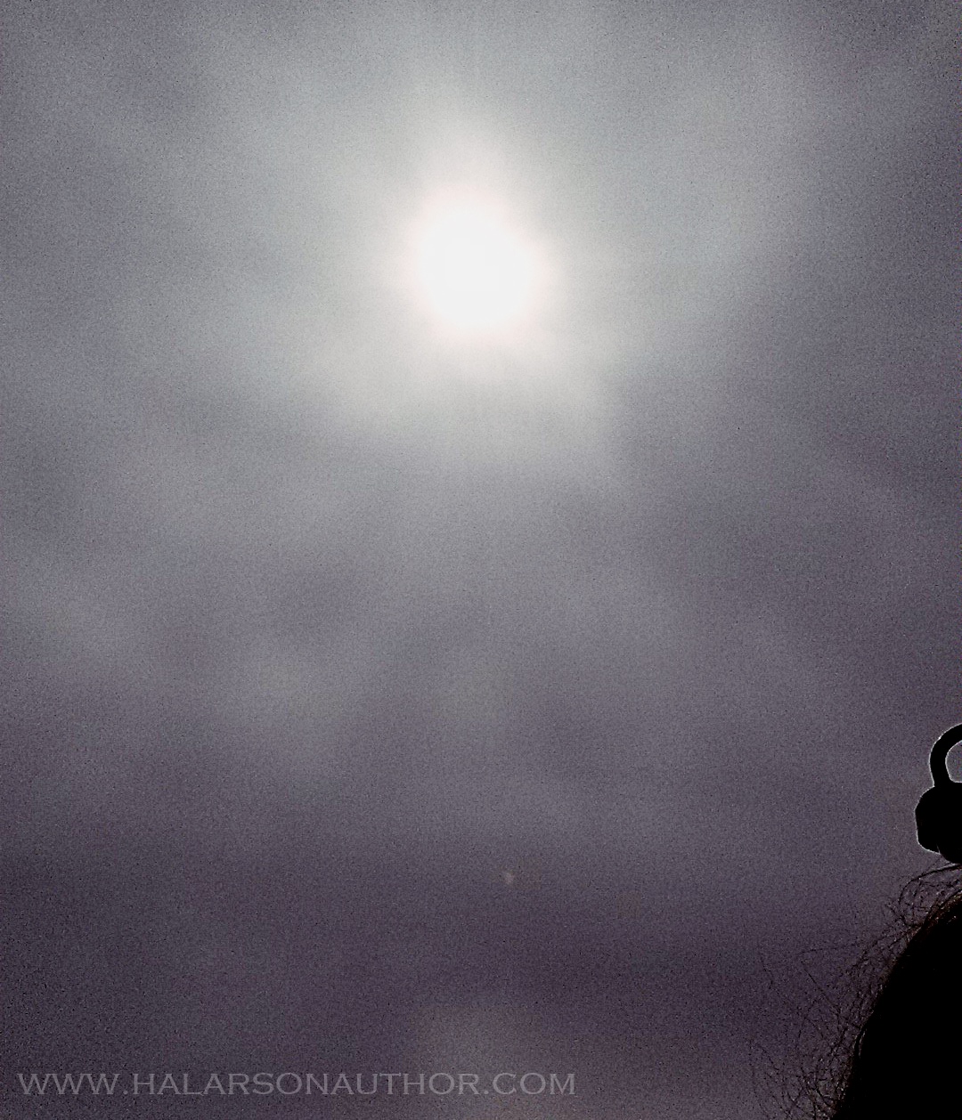 Luckily, I had the glasses so I went back to looking directly at it through my protective filters. The eclipse was mostly done (or at totality) at this point, with just a sliver of a crescent on the left-hand side of the Sun. I took several pictures, this being one of them.