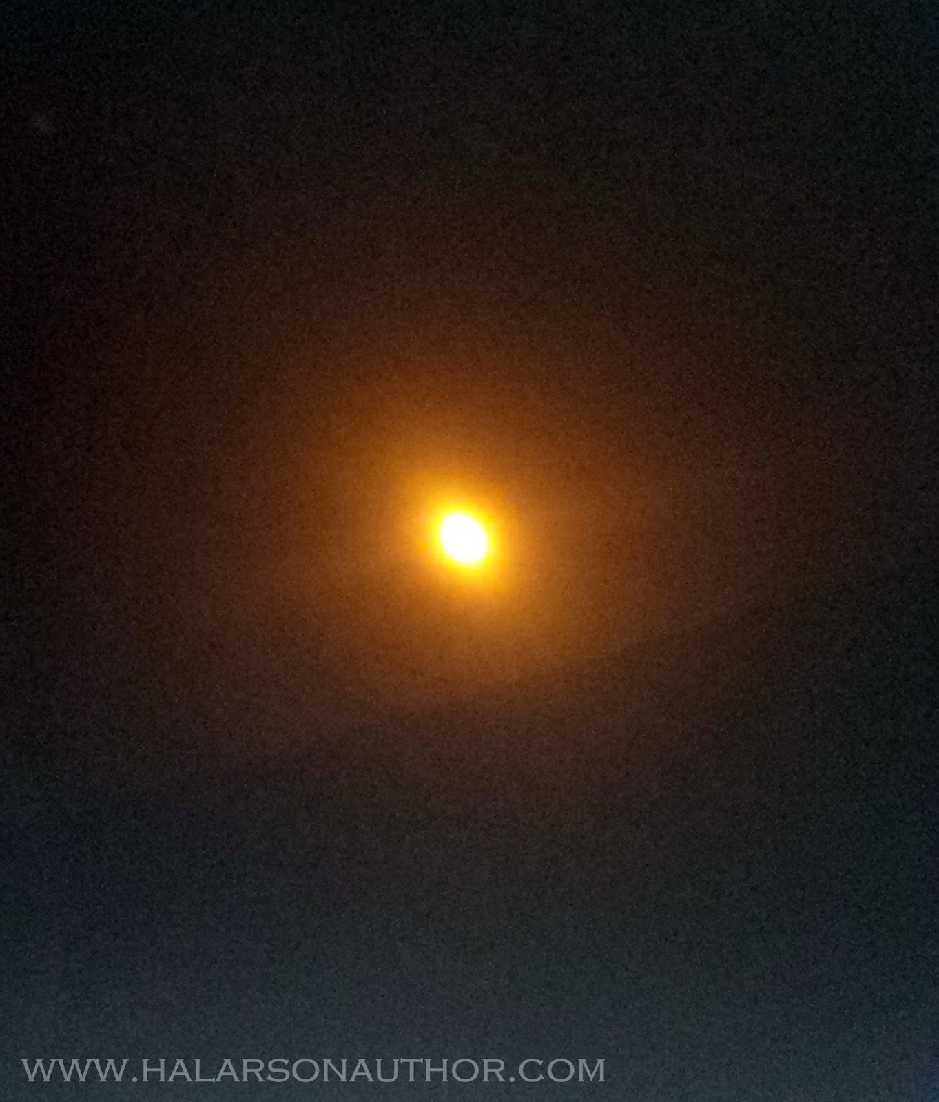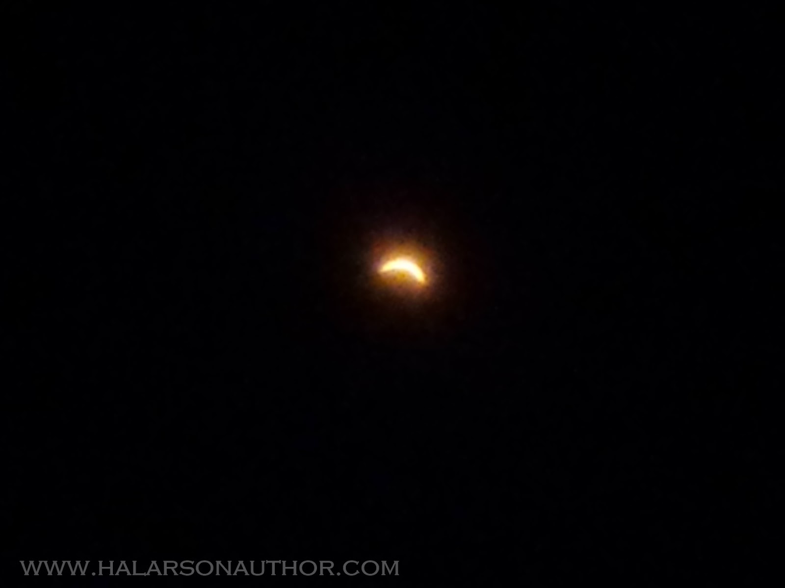 The Moon then started to move and the crescent portion of the Sun that was visible shifted to the top. At this point, I increased the magnification on my cell phone and took this photo through my glasses.