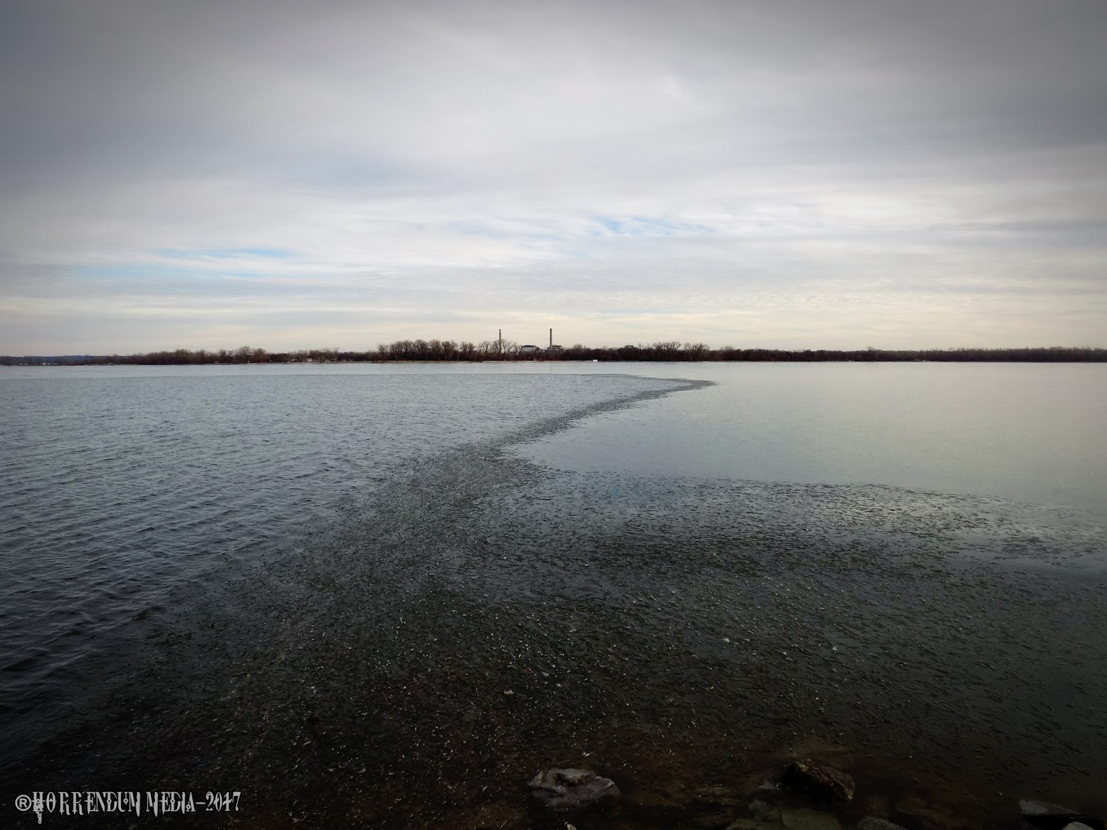 A view out into the lake and it's clear demarcation. On the right is where the ice from the cold weather is clinging to existence, while on the left is the melted lake from the warm temperatures. The sound of the two as they crashed against each other was akin to the muffled sound of light, thin glass breaking.