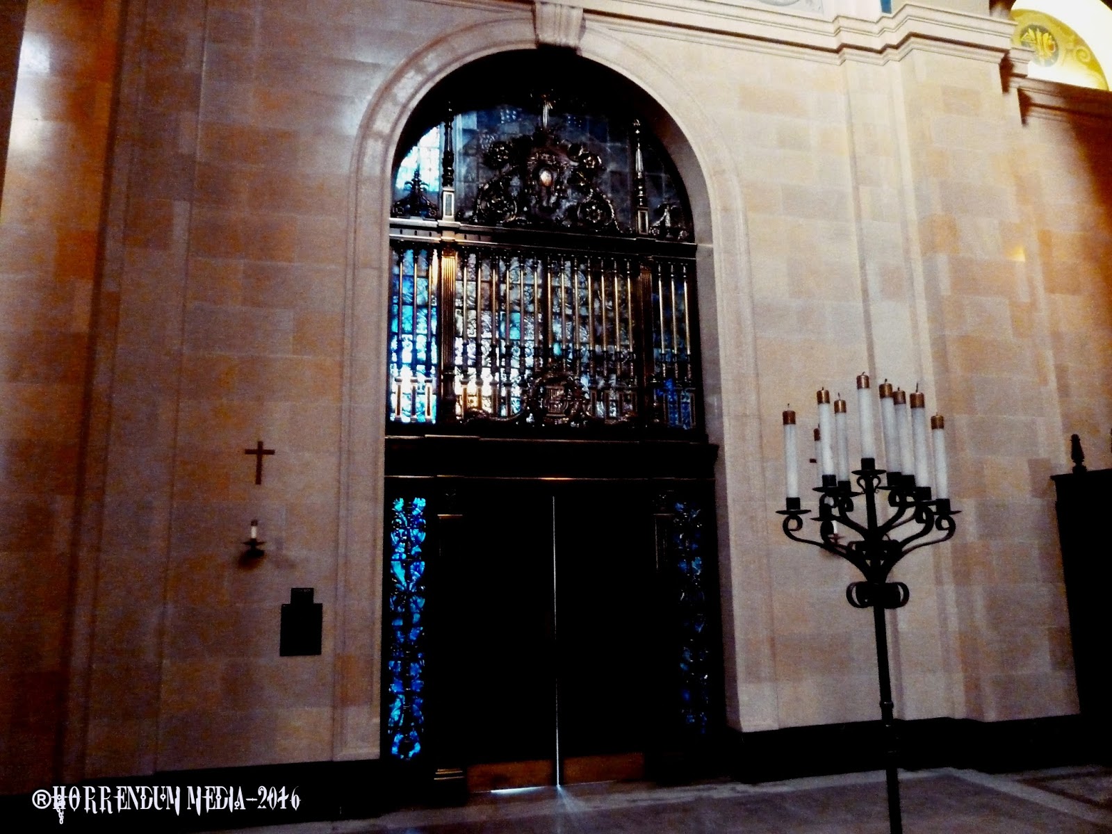 This is one of many doors you will find inside the church. It has a beautifully, hand-crafted metal frame with decadent stained-glass windows.