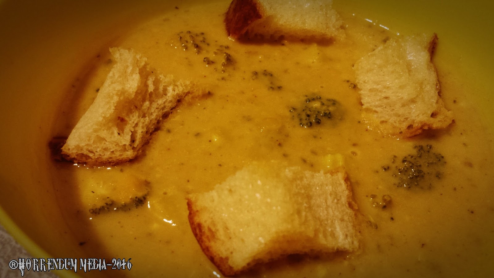 Broccoli "Cheese" Soup with Homemade CroutonsAhh, Winter. The perfect time to stay at home, curled up under some blankets, while reading a book or watching a movie with a steaming hot cup of cocoa, tea, or maybe even a stiff drink. It's time to warm up the house with the scent of baking, and cook some rib-sticking meals. One of my favorite rib-sticking meals for Winter are soups and stews. (I've elaborated more on that, including the pans I use, here.)