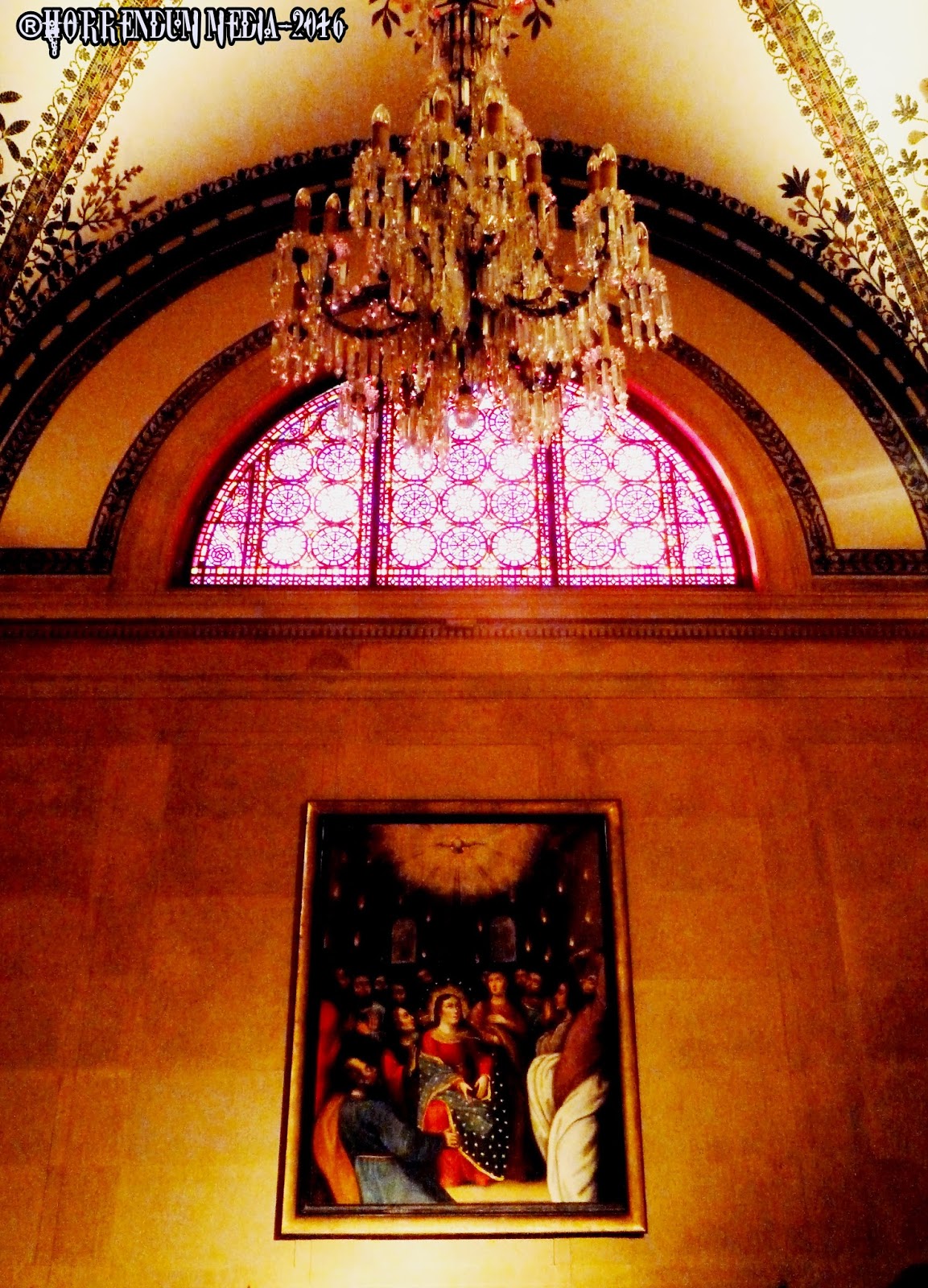 A small chapel can be found off of the right aisle, and it's exquisite and rich. An ornate ceiling, fantastic painting, red stained-glass, and a large chandelier adorn this small room.