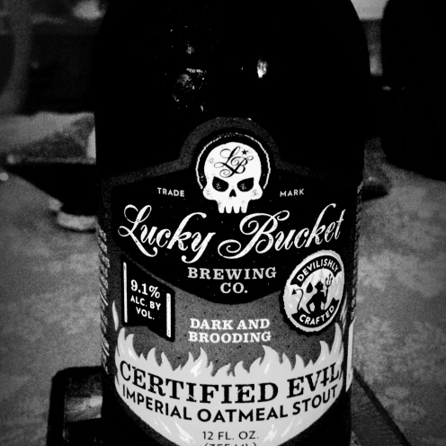 Lucky Bucket's Certified Evil Imperial Oatmeal StoutThis is a proper dark beer. It's deep, rich, and creamy, leaving you with a pleasant aftertaste and a sense of great satisfaction. I love the gothy vibe of the bottle as well, "Dark and Brooding" indeed.