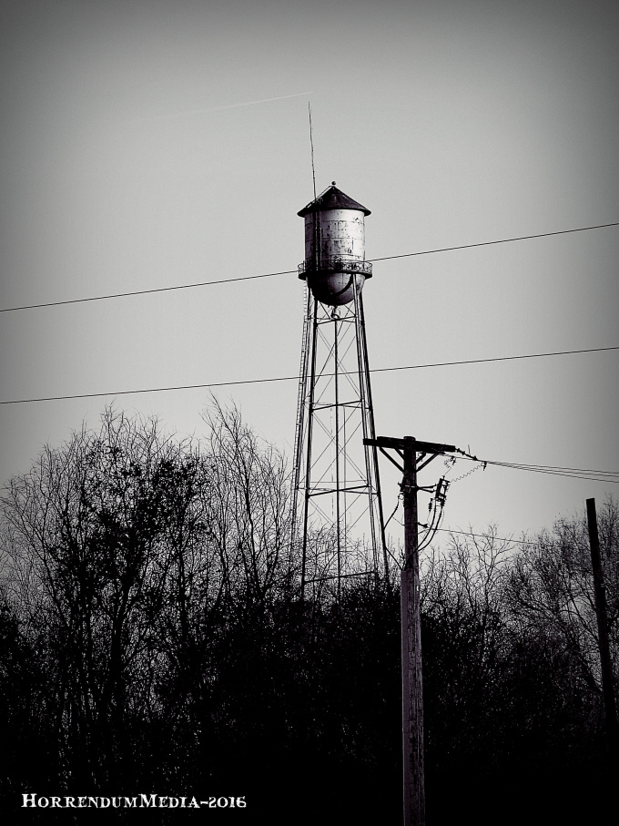 A water tower looms in the sky, more than likely a retired one linked to an industrial plant of some kind.