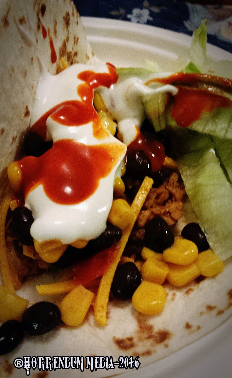 As a vegan, my main fillers for tacos are numerous. I can use beans, refried beans, seasoned rice, lentils, chickpeas, bulgur wheat, crumbled & seasoned tofu, etc. etc. As for myself, I typically fall back on that bastion of cheap versatility: TVP. Now, if you don't know what that is, it's short for textured vegetable protein. If you ever purchased the bright red, fake bacon bits in the grocery store, they are made out of seasoned bits of TVP. I cook with TVP fairly regularly, as it's a super-quick way to make a variety of "meat" crumbles.