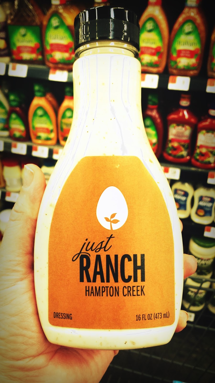 Like many vegans, I love Hampton Creek. They've found a way to veganize things that still taste good. Their mayo tastes like regular mayo using vegan ingredients. I finally located one (just one sadly) tub of their cookie dough at Super Target, which will never get baked let me tell you. They have been announcing regularly on their facebook page that they would be selling their Ranch dressing at Walmart, and luckily, I found it at my local one. I bought two bottles!