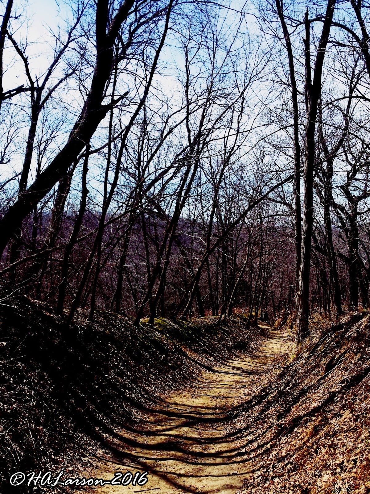 The duality of the trail made possible through a hidden fork in the trail. Even the stark, bare trees look content and peaceful here. Is it any wonder I adore being outside?