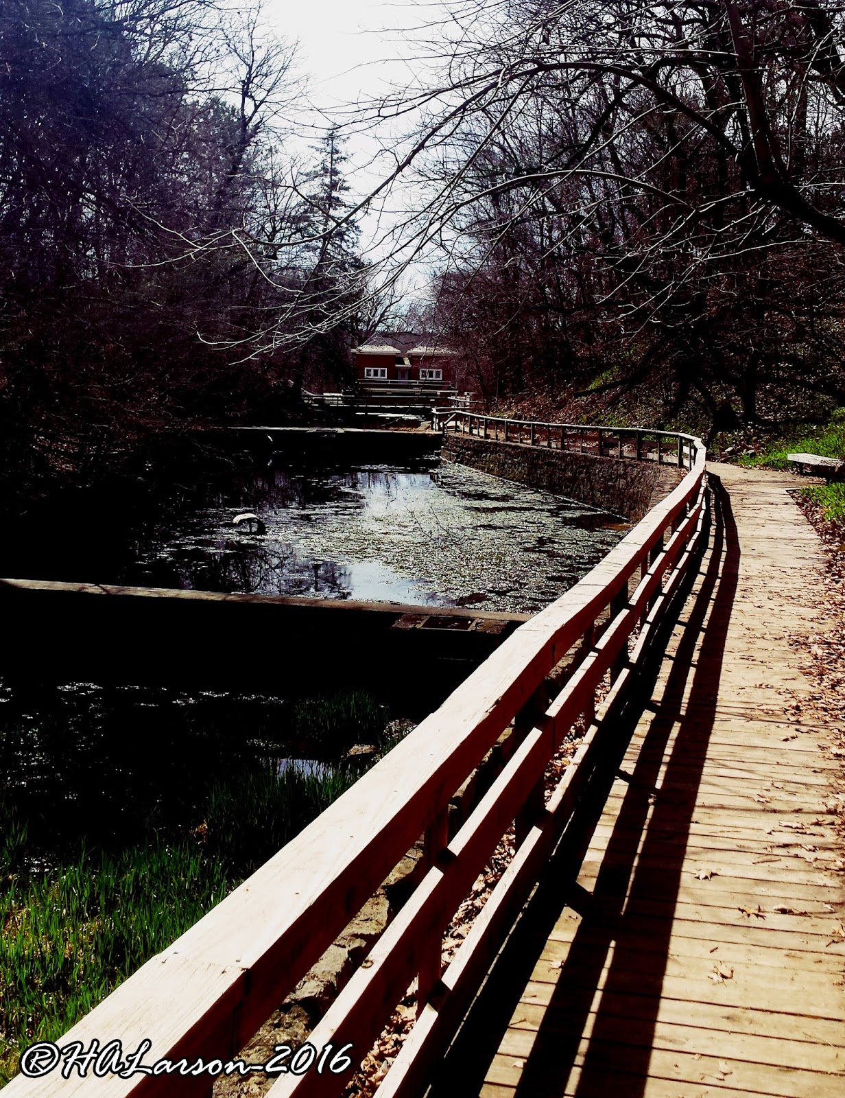 A view down the boardwalk that lines the hatch ponds and leads down to the Hatch House.