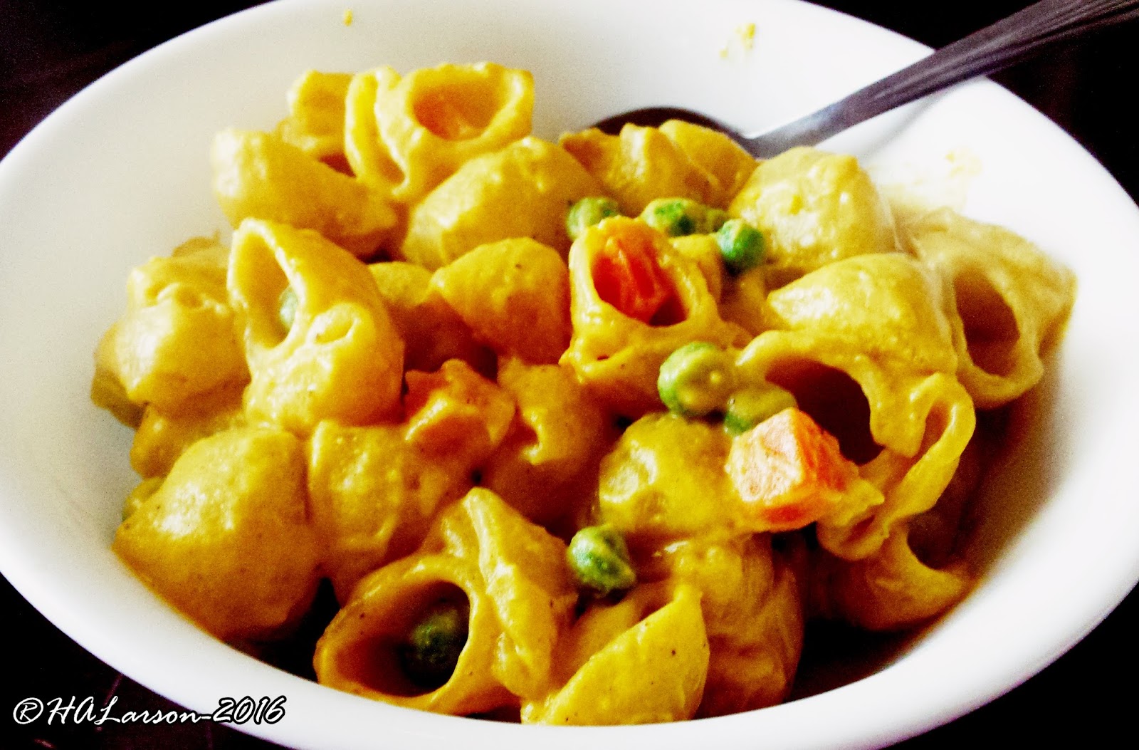 The cheeze sauce lovingly embracing a bed of pasta and veggies.