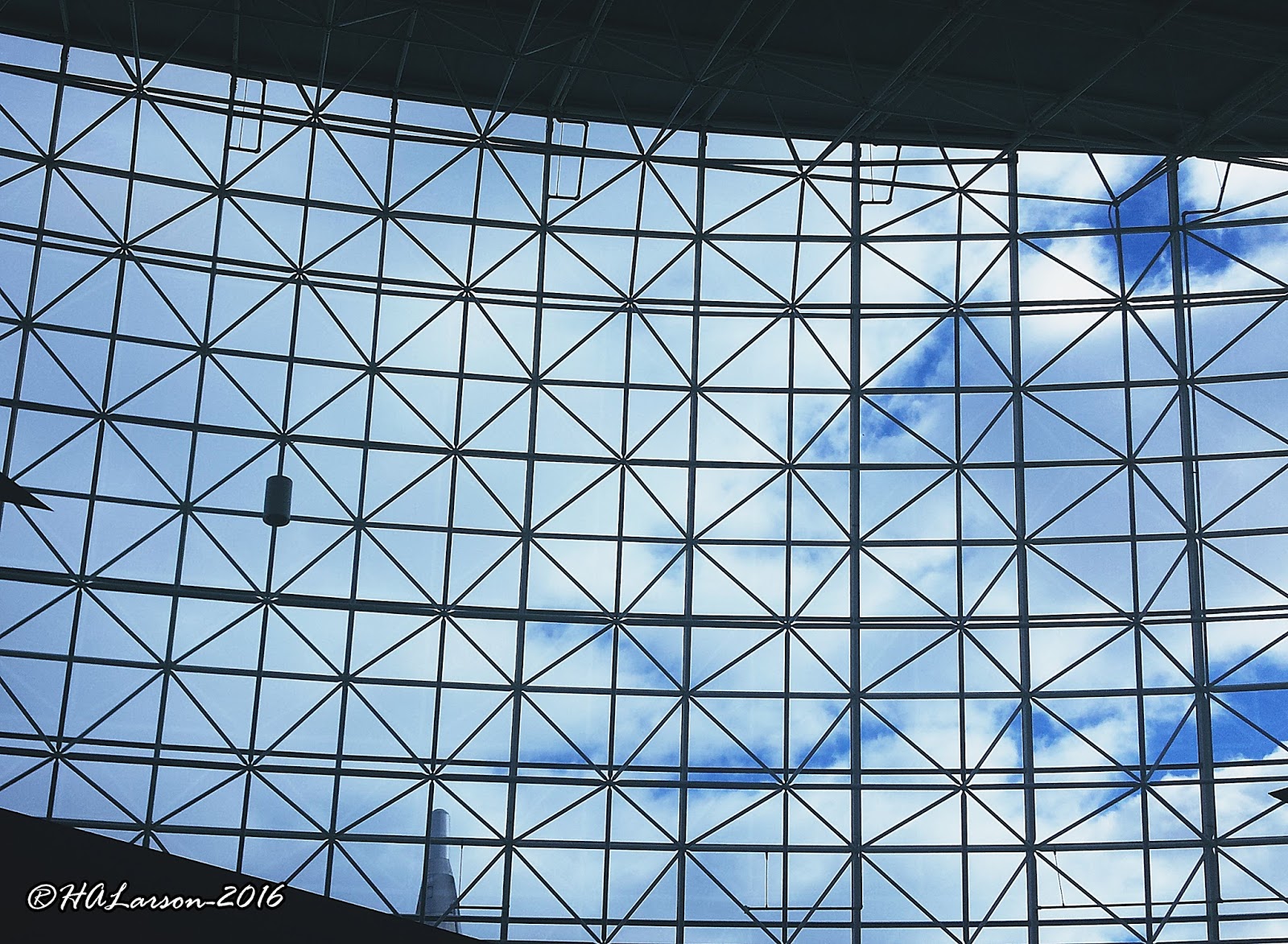 A view of the glass-paned walls of the museum. It's an impressive sight from the lobby and is 'watched over' by a massive fighter plane that you cannot fit into one shot.
