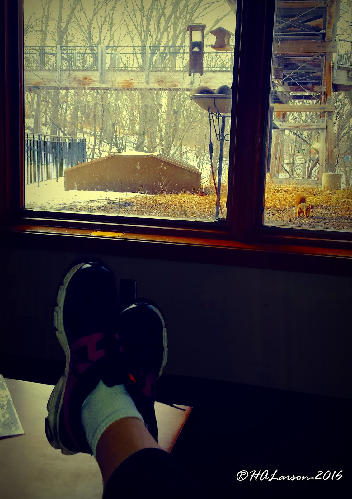 Yesterday was in the 40s, and during this time of year (and considering how the weather has been) that is a heatwave! I was itching to get outside pretty badly, so, since my husband and son were gone, I decided it would be the perfect time to get my daughter out for some much-needed mom-daughter time. We grabbed a light lunch, and then headed down to Fontanelle Nature Center. They have a very long boardwalk that I figured would be perfect for getting in a good "hike" since whatever trails might be free of snow would just be a sloppy, muddy mess. It was gorgeous out, and I feel like I got my batteries recharged.