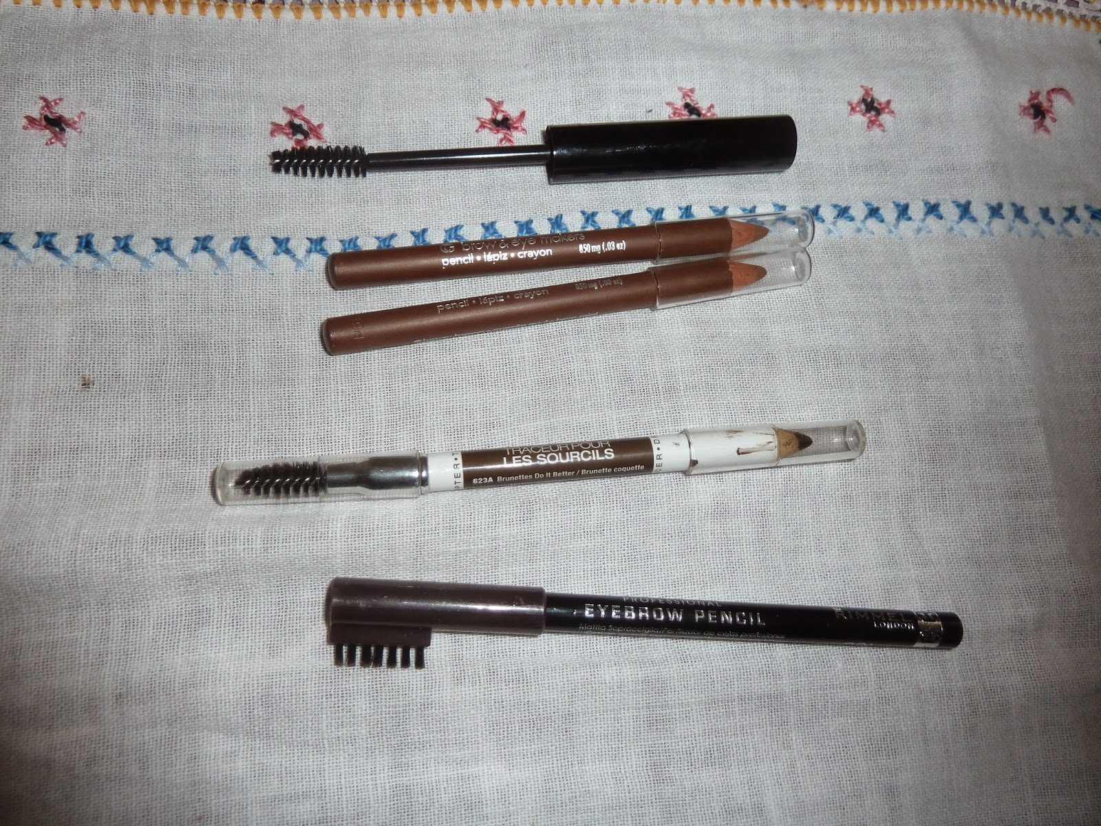This is my eyebrow stuff. I had a bad elf mascara so I cleaned the brush and saved it for grooming my eyebrows or for when my other mascara gets clumpy. The light brown pens are no good for my collor, and the bottom one, by Wet 'n Wild is my favorite.