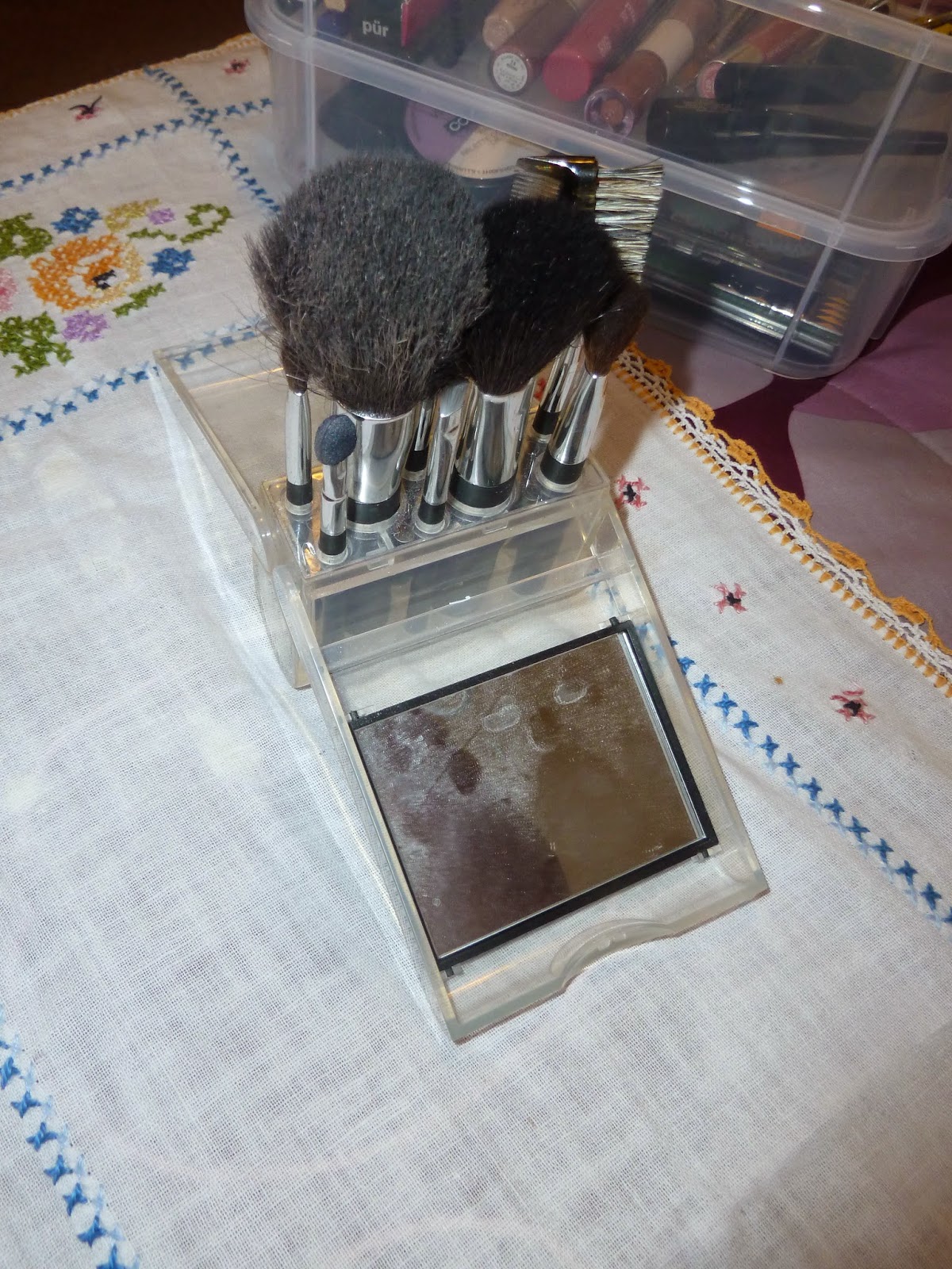 This is my old brush collection: well-loved and well-used. I really need to wash these brushes, and it's on my to-do list, I swear!