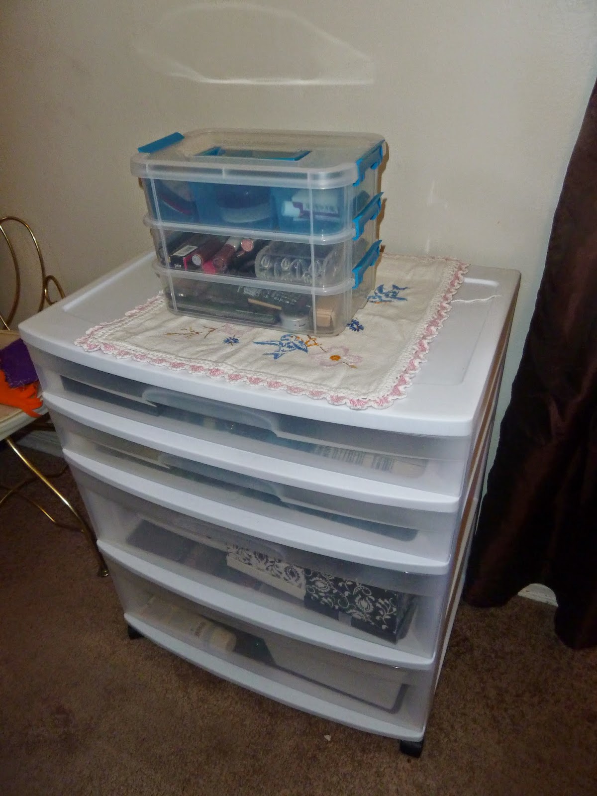 The white drawer unit is where I keep most of my beauty essentials. The container on top is makeup.