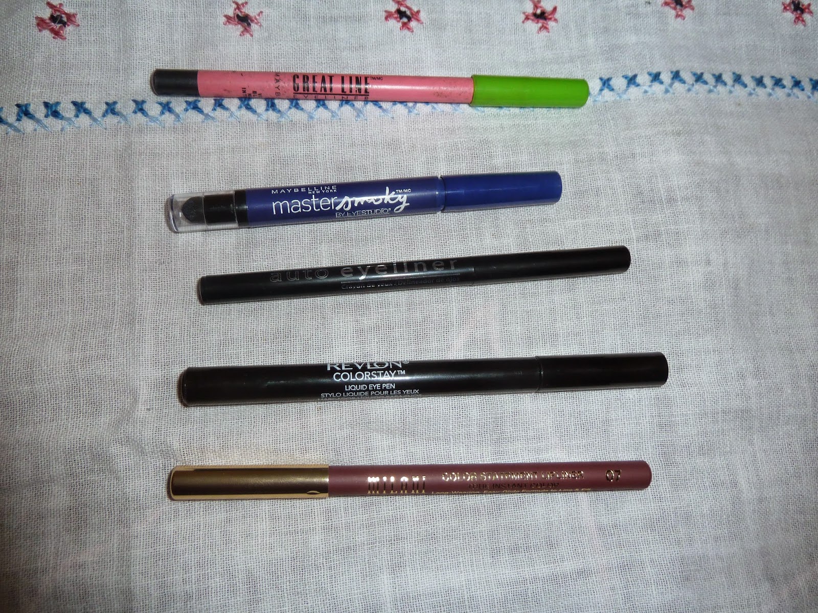 Some eye liners. The old tried and true Maybelline, a smokey eye pen by Maybelline as well in blue, L.A. colors dial-up black pen, Revlon felt-liner (one of my all-time faves), and the last is actually a lip liner, also shown in my dollar store haul.