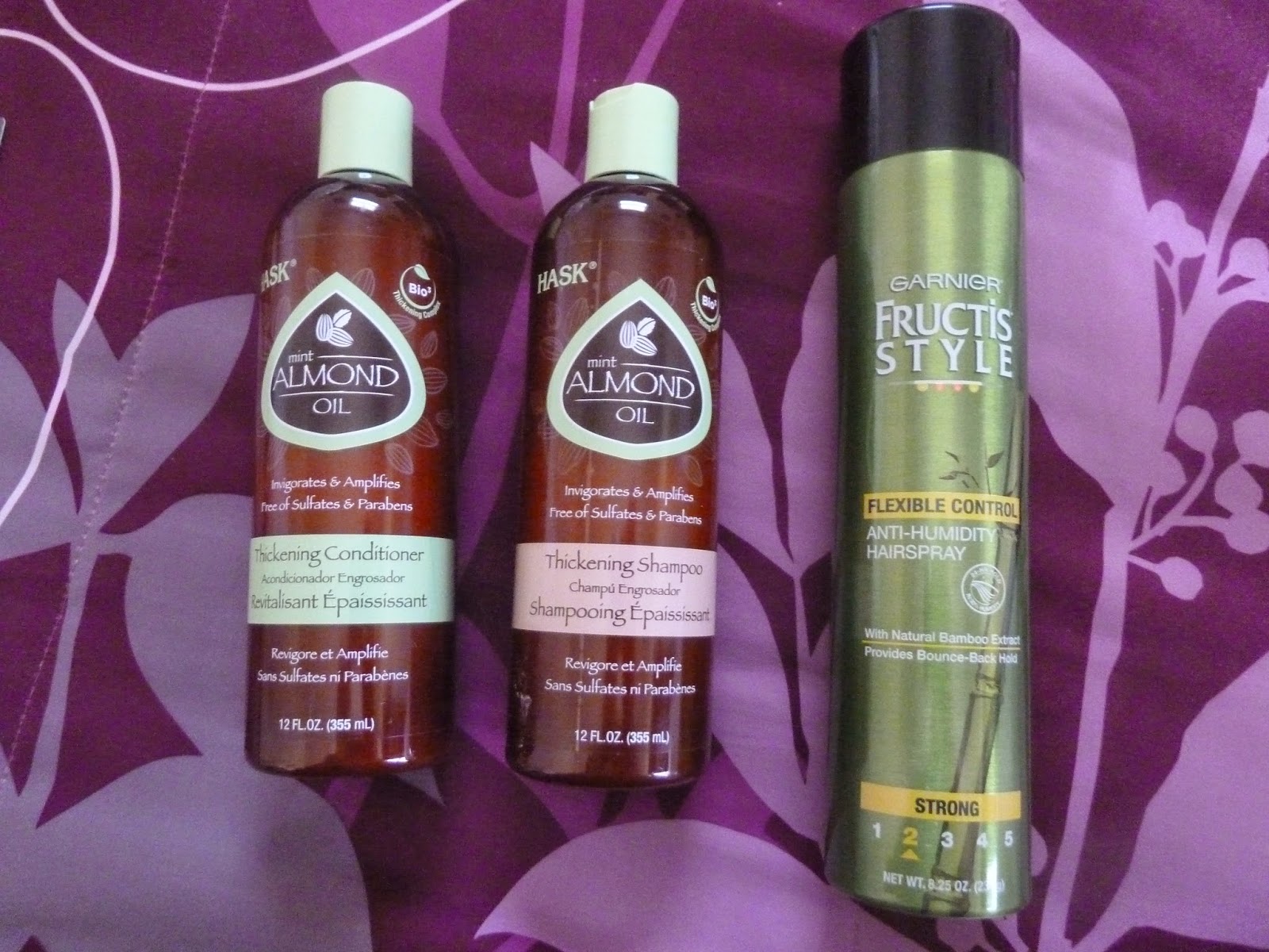 I use Suave hair products regularly, but I was intrigued by the Hask Mint & Almond Oil thickening shampoo and conditioner. I'm trying to stay away from products that have silicone and Suave is a guilty party. Anyway, the Hask was on sale and as I have thin hair with grey "highlights" I thought I'd give this a try. I love the way mint and almond oil smell, so there's that too. I also grabbed some flexible hold Garnier Fructis hairspray. I style my hair lightly, and this works great for that. It allows me to spray and scrunch without gluing my hair.