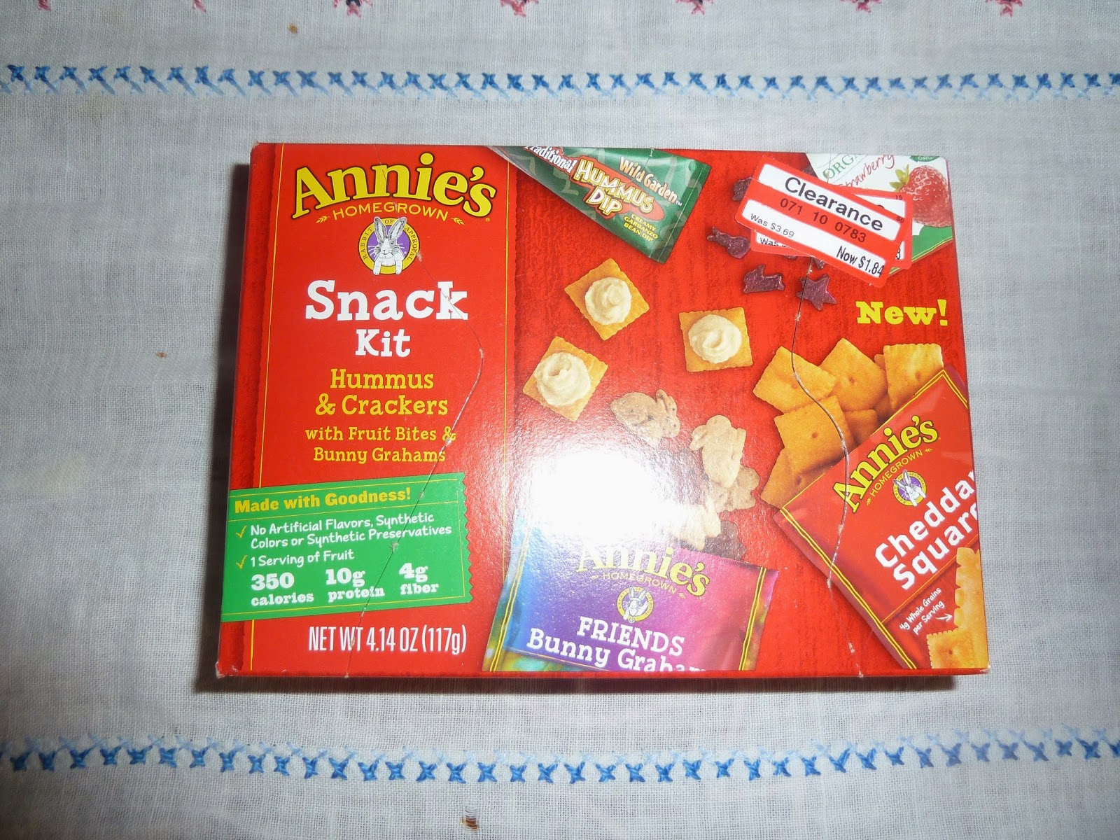 Then I ran into these. These organic Annie's snack kits each contain hummus, cheese crackers, bunny graham crackers, and fruit snacks. They were only $1.78 each! They are usually around the $5 mark so these were a complete score. My intent is to use for hikes, and we've already used them twice. I take our water bottles and we're set. I bought all they had left, which was about 6. :)