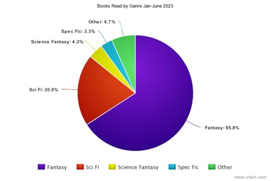 This time last year Fantasy made up 64% of my reading, and I’m amused by how little that’s changed. Sci Fi and Science Fantasy both have slightly smaller slices of the pie than they did in 2022, but this is also my first year using Spec Fic as a category, which might have made some of the difference.