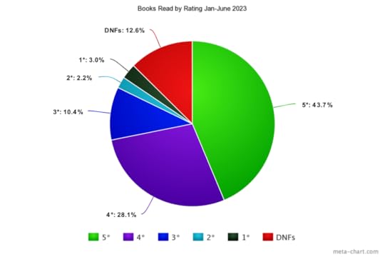 FAR less of my reading ended up as DNFs this year; only 12.6% compared to last year’s 23%. That’s almost halved! I wonder what’s changed – have I just gotten lucky with the books I’ve picked up, or am I getting better at guessing which books I’m going to like?