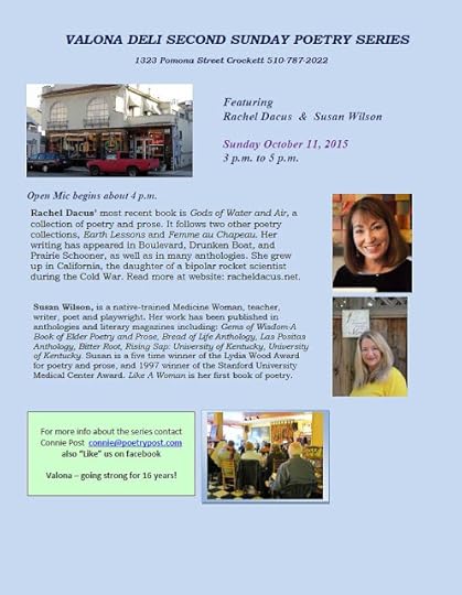 Next Sunday, October 11, at 3 pm in picturesque Crockett, California, I'll be a featured reader at the Valona Deli Second Sunday Poetry Series. Coordinator Connie Post kindly invited me. If you're in the SF Bay Area and can make it, it would be wonderful to see you! There's an open mic after the two featured readers, and a terrific jazz ensemble plays at 6 pm after the poetry.