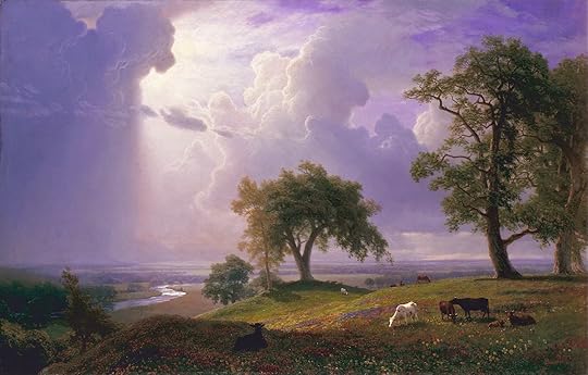 The only way to sanely start a week, if you're a poet, is with metaphor. Reading to start and revising is the juice. I have three inches of print drafts to plow through, how many e-files, and am grabbing summer by the shorthairs to make a space for poetry. I need to make a fresh pile of worked-up stuff, need time and peace. Hedging my priorities. Here's one from Gods of Water and Air. Have a luminous day.<!-- /* Font Definitions */ @font-face {font-family:Palatino; panose-1:2 0 5 0 0 0 0 0 0 0; mso-font-charset:0; mso-generic-font-family:auto; mso-font-pitch:variable; mso-font-signature:3 0 0 0 1 0;} @font-face {font-family:MingLiU_HKSCS-ExtB; panose-1:2 2 5 0 0 0 0 0 0 0; mso-font-charset:81; mso-generic-font-family:auto; mso-font-pitch:variable; mso-font-signature:-2147483601 168296456 16 0 1048577 0;} /* Style Definitions */ p.MsoNormal, li.MsoNormal, div.MsoNormal {mso-style-unhide:no; mso-style-qformat:yes; mso-style-parent:""; margin:0in; margin-bottom:.0001pt; mso-pagination:widow-orphan; font-size:12.0pt; font-family:"Times New Roman"; mso-fareast-font-family:"Times New Roman";} .MsoChpDefault {mso-style-type:export-only; mso-default-props:yes; font-size:10.0pt; mso-ansi-font-size:10.0pt; mso-bidi-font-size:10.0pt;} @page WordSection1 {size:8.5in 11.0in; margin:1.0in 1.25in 1.0in 1.25in; mso-header-margin:.5in; mso-footer-margin:.5in; mso-paper-source:0;} div.WordSection1 {page:WordSection1;} </style> <br /><div class="MsoNormal"><b style="mso-bidi-font-weight: normal;"><span style="font-family: Palatino; mso-fareast-font-family: MingLiU_HKSCS-ExtB;"><span style="mso-spacerun: yes;"> </span>American Luminous</span></b><i style="mso-bidi-font-style: normal;"><span style="font-family: Palatino; mso-fareast-font-family: MingLiU_HKSCS-ExtB;"> </span></i> </div><div class="MsoNormal"><i style="mso-bidi-font-style: normal;"><span style="font-family: Palatino; mso-fareast-font-family: MingLiU_HKSCS-ExtB;">“California Spring” by Alfred Bierstadt</span></i></div><div class="MsoNormal"><br /></div><div class="MsoNormal"><span style="font-family: Palatino; mso-fareast-font-family: MingLiU_HKSCS-ExtB;">The painting at the de Young Museum</span></div><div class="MsoNormal"><span style="font-family: Palatino; mso-fareast-font-family: MingLiU_HKSCS-ExtB;">is so big I can walk ten steps </span></div><div class="MsoNormal"><span style="font-family: Palatino; mso-fareast-font-family: MingLiU_HKSCS-ExtB;">before reaching the other side.</span></div><div class="MsoNormal"><span style="font-family: Palatino; mso-fareast-font-family: MingLiU_HKSCS-ExtB;">Stepping out from under the umbrella </span></div><div class="MsoNormal"><span style="font-family: Palatino; mso-fareast-font-family: MingLiU_HKSCS-ExtB;">thundercloud onto a slope, I pause </span></div><div class="MsoNormal"><span style="font-family: Palatino; mso-fareast-font-family: MingLiU_HKSCS-ExtB;">inside the canvas and rest </span></div><div class="MsoNormal"><span style="font-family: Palatino; mso-fareast-font-family: MingLiU_HKSCS-ExtB;">next to a cow. I’ve left the actual </span></div><div class="MsoNormal"><span style="font-family: Palatino; mso-fareast-font-family: MingLiU_HKSCS-ExtB;">California to contemplate its light </span></div><div class="MsoNormal"><span style="font-family: Palatino; mso-fareast-font-family: MingLiU_HKSCS-ExtB;">and illuminated mists, the way they billow </span></div><div class="MsoNormal"><span style="font-family: Palatino; mso-fareast-font-family: MingLiU_HKSCS-ExtB;">and thin as the sun’s roving spotlights</span></div><div class="MsoNormal"><span style="font-family: Palatino; mso-fareast-font-family: MingLiU_HKSCS-ExtB;">ray out over inky valley oaks. </span></div><div class="MsoNormal"><br /></div><div class="MsoNormal"><span style="font-family: Palatino; mso-fareast-font-family: MingLiU_HKSCS-ExtB;">That dot on the hills---</span><span style="font-family: Palatino; mso-fareast-font-family: MingLiU_HKSCS-ExtB;">a wagon train?</span></div><div class="MsoNormal"><span style="font-family: Palatino; mso-fareast-font-family: MingLiU_HKSCS-ExtB;">Stunned settlers stopped to ponder </span></div><div class="MsoNormal"><span style="font-family: Palatino; mso-fareast-font-family: MingLiU_HKSCS-ExtB;">a life so wide. They’ll snug their hopes </span></div><div class="MsoNormal"><span style="font-family: Palatino; mso-fareast-font-family: MingLiU_HKSCS-ExtB;">into cabins and live in miniature</span></div><div class="MsoNormal"><span style="font-family: Palatino; mso-fareast-font-family: MingLiU_HKSCS-ExtB;">under skies with county-large shadows.</span></div><div class="MsoNormal"><span style="font-family: Palatino; mso-fareast-font-family: MingLiU_HKSCS-ExtB;">One among them wonders</span></div><div class="MsoNormal"><span style="font-family: Palatino; mso-fareast-font-family: MingLiU_HKSCS-ExtB;">how to cover a canvas with this horizon. </span></div><div class="MsoNormal"><span style="font-family: Palatino; mso-fareast-font-family: MingLiU_HKSCS-ExtB;">Bringing their pianofortes, they plunge</span></div><div class="MsoNormal"><span style="font-family: Palatino; mso-fareast-font-family: MingLiU_HKSCS-ExtB;">into birdsong thick along the river’s length </span></div><div class="MsoNormal"><span style="font-family: Palatino; mso-fareast-font-family: MingLiU_HKSCS-ExtB;">and the rattle of a thousand alders.</span></div><div class="MsoNormal"><br /></div><div class="MsoNormal"><span style="font-family: Palatino; mso-fareast-font-family: MingLiU_HKSCS-ExtB;">With their cousins and aunts </span></div><div class="MsoNormal"><span style="font-family: Palatino; mso-fareast-font-family: MingLiU_HKSCS-ExtB;">they weave through rock fields </span></div><div class="MsoNormal"><span style="font-family: Palatino; mso-fareast-font-family: MingLiU_HKSCS-ExtB;">and forests the size of cities. </span></div><div class="MsoNormal"><span style="font-family: Palatino; mso-fareast-font-family: MingLiU_HKSCS-ExtB;">This landscape devou