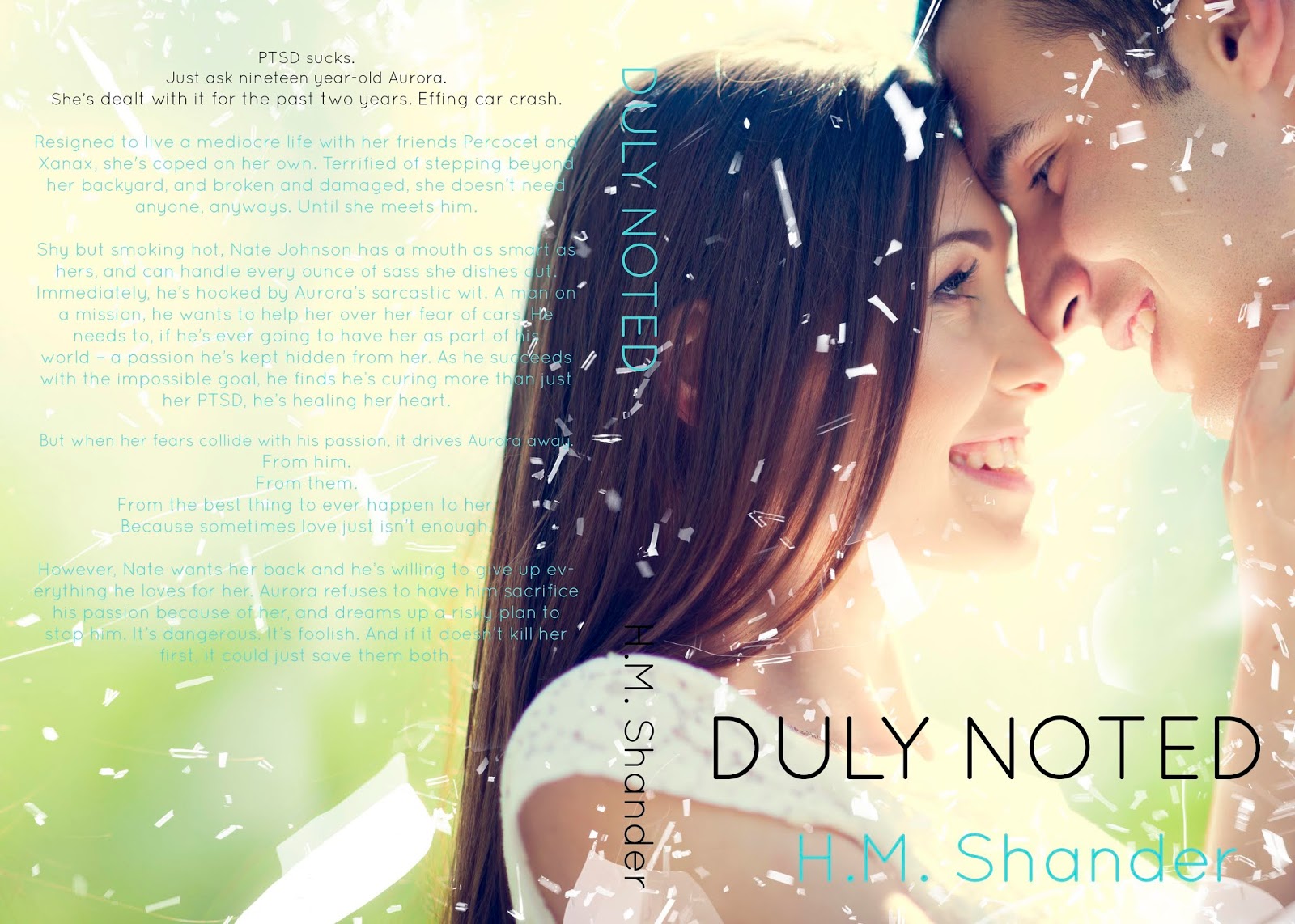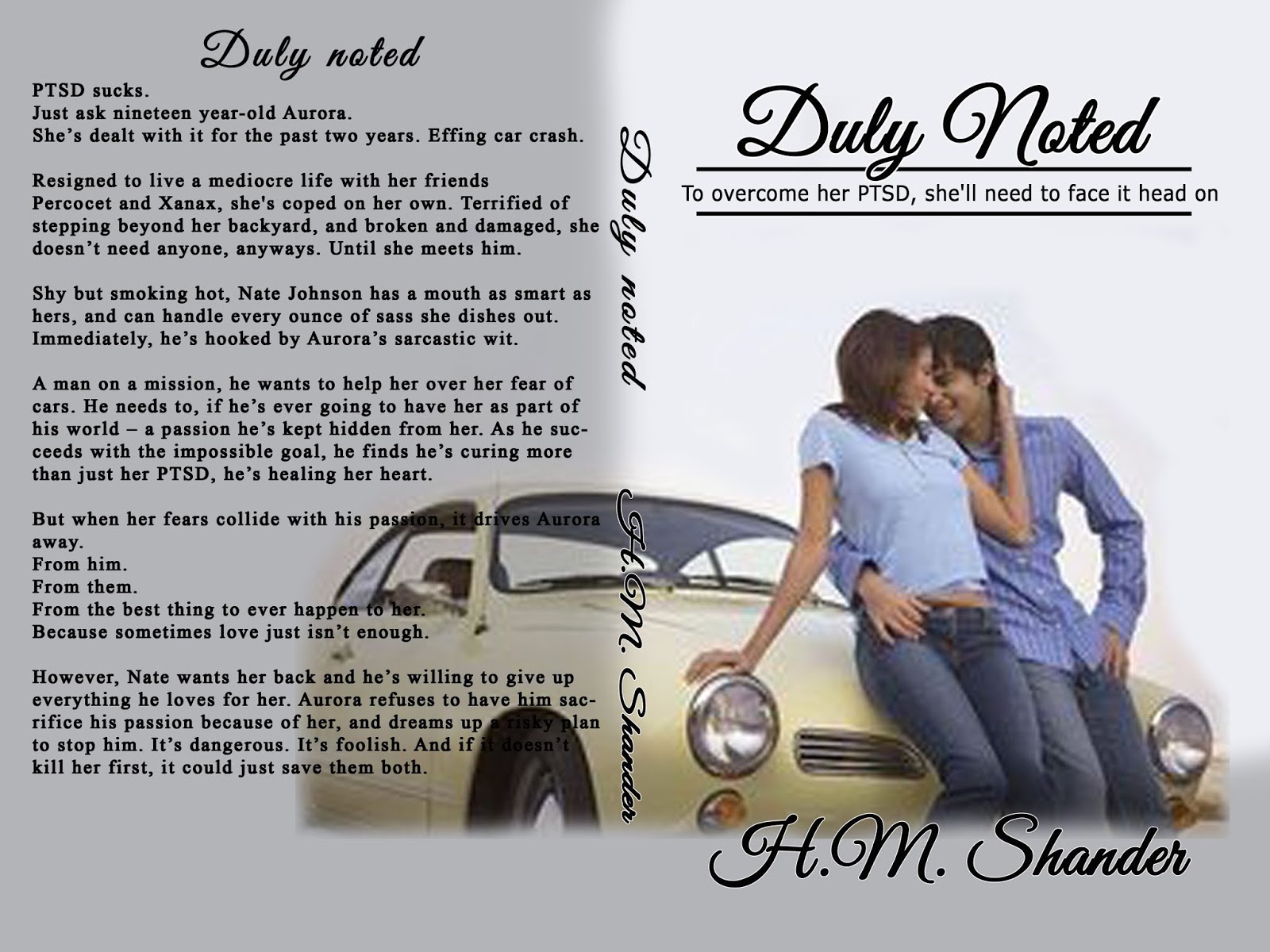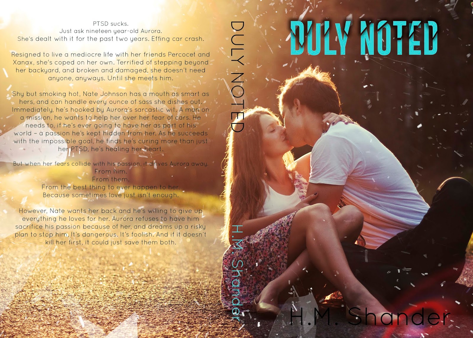 This was the final cover, and I am completely in love with it. It captures Aurora and Nate perfectly as her PTSD stemmed from a car crash (thus them sitting on the road) and she had little bits of shattered glass over top and it fit within the romance genre perfectly. Well done.