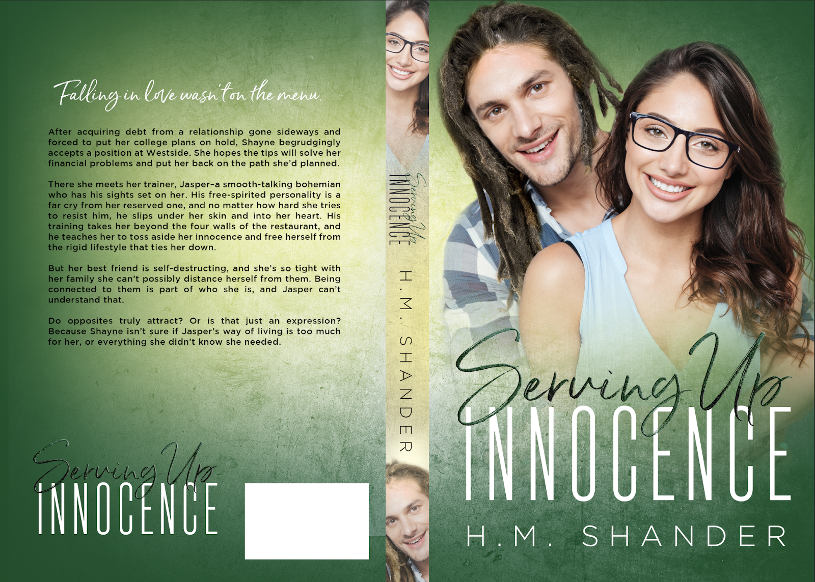 concept 3We darkened the green to a more jade colour as the FMC's nickname is Jade. Perfect, that works. She darkened the guy's dreads and it was tolerable. It worked but it wasn't perfect. It didn't have that **WOW** I was looking for, but she had three other covers of mine to work on, so I accepted this (concept 3) and blasted it out with all the pre-order links. I'm not a big pre-seller, but my pre-orders do well enough for me. A month out from the release of Innocence and there was nothing. I asked a few trusted people and they all said it was the cover and the man on the cover looked off, which I agreed with. It just didn't have the zip and the male wasn't a natural dreadlock wearing individual.
