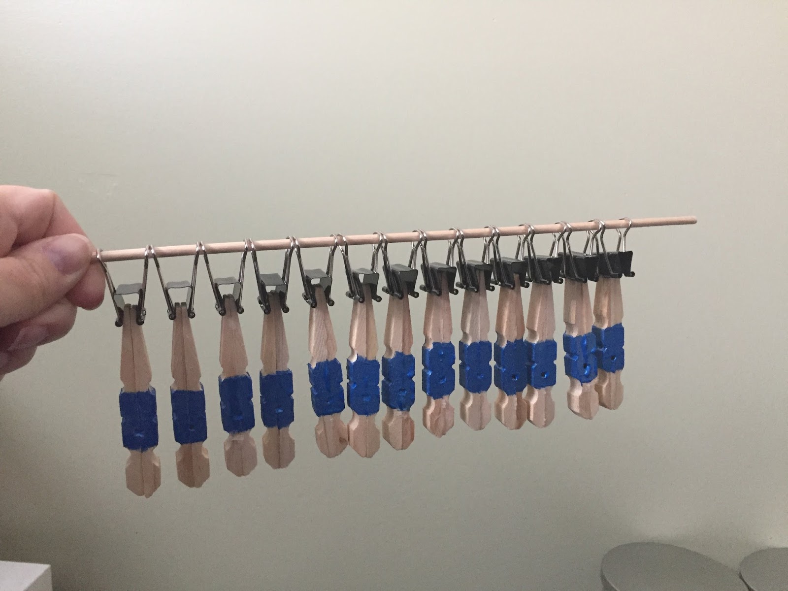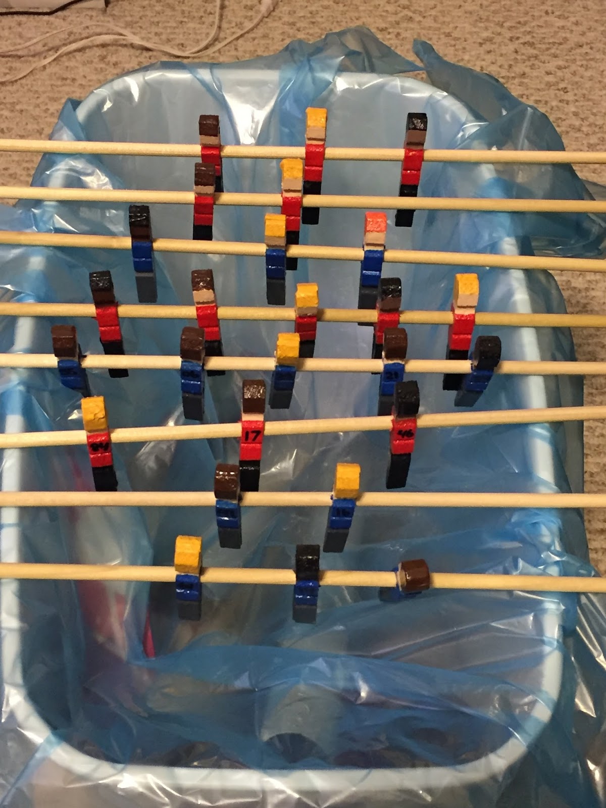Binder clips work awesome to hold them while they dry. ;) After all men were painted, each got a number on his back before the varnish went on and were tested to make sure the dowel fit through when everything dried.