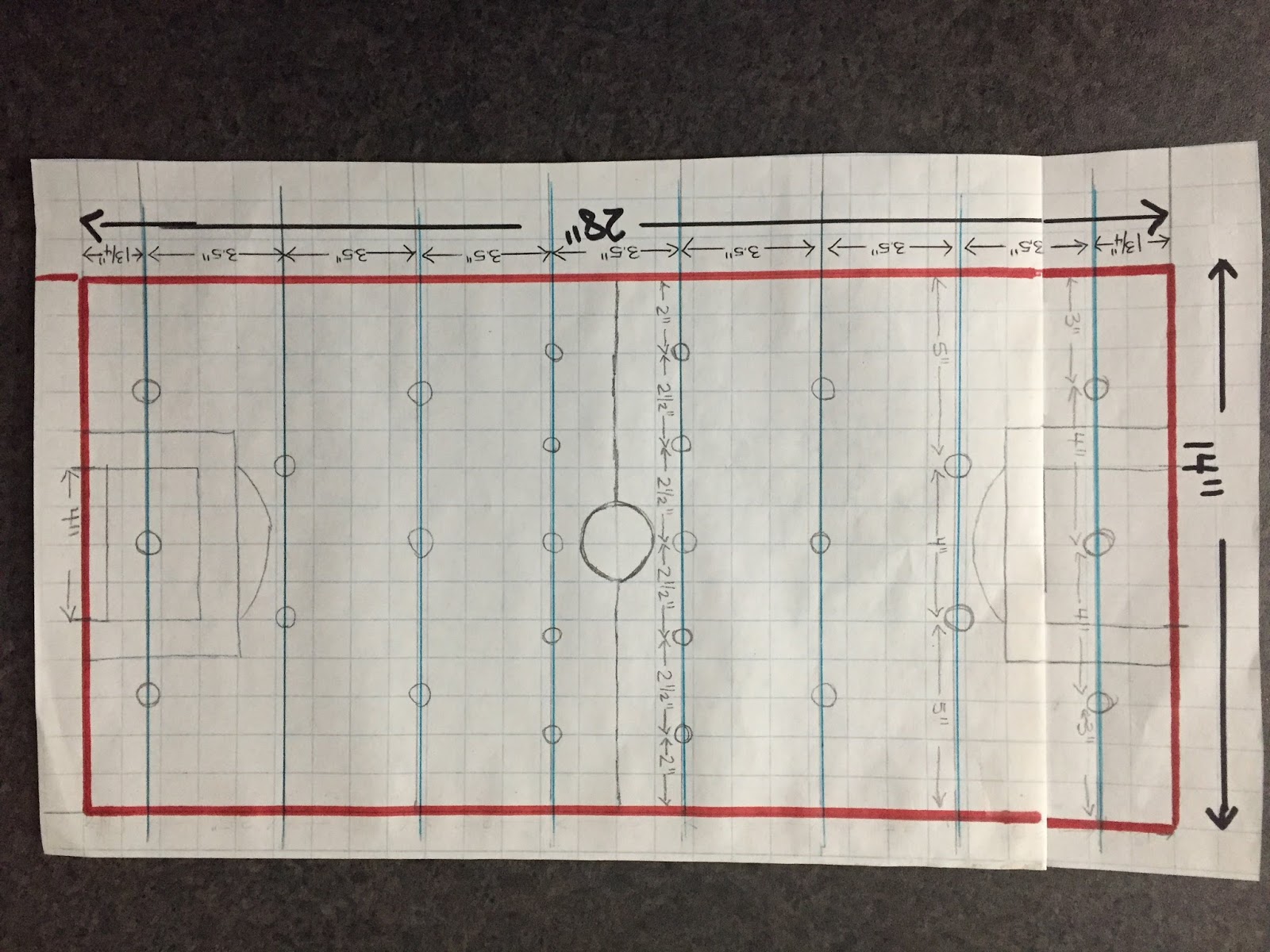 Then came the fun part. I'm not a math person by any stretch, but I drew out and mapped the layout so I'd know how much wood I needed, based on the size of the men and the distance apart they needed to be. They could be spaced even an inch further apart which would add to the overall length, but for mine, it worked out okay even if they men have potential to hit each other on occasion. Like I said, there were no drawings/diagrams for me to base a smaller version on.