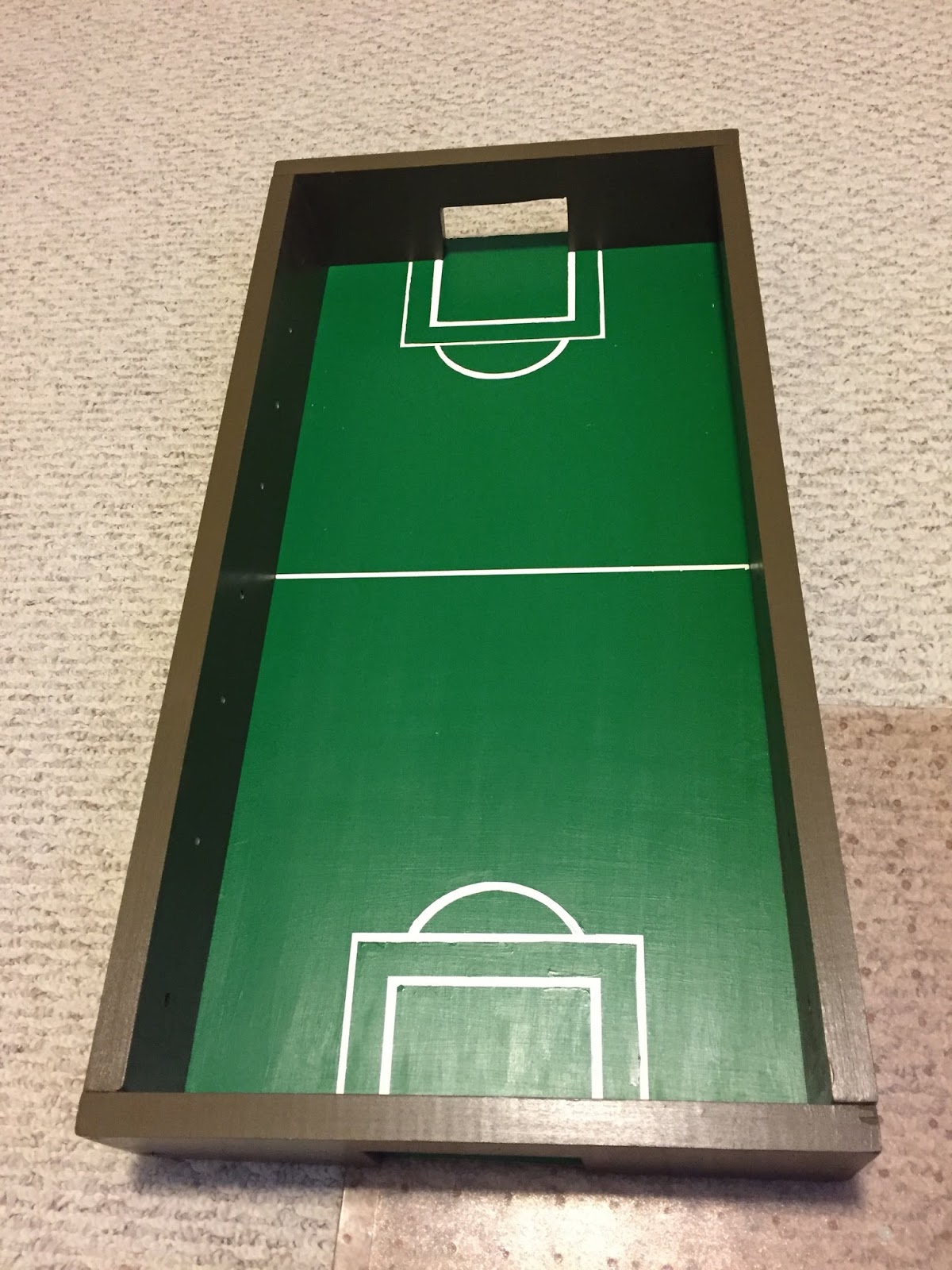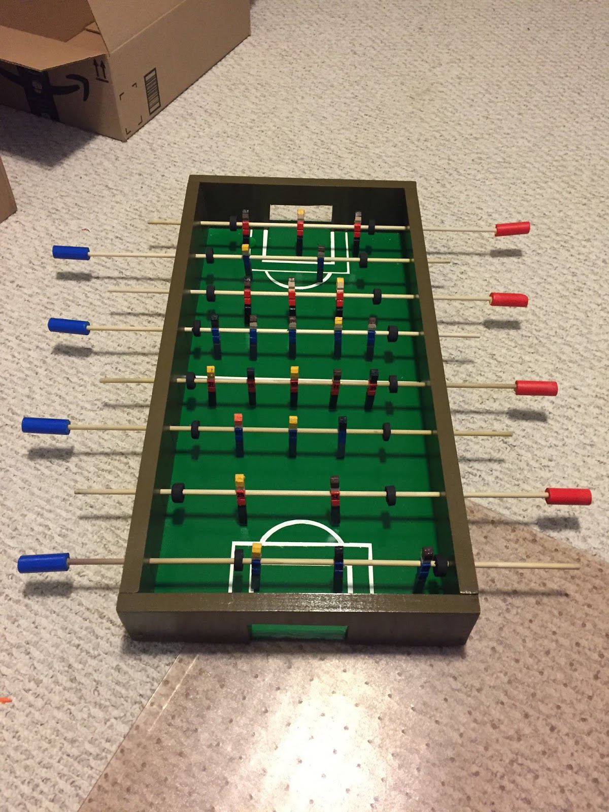 My oldest came into the room and we tested it out with a little ball. It works well and the players are good kickers. Now to wait until Christmas Day to reveal my project. Can't wait to see his little face. I hope he likes it. I'll keep you posted.