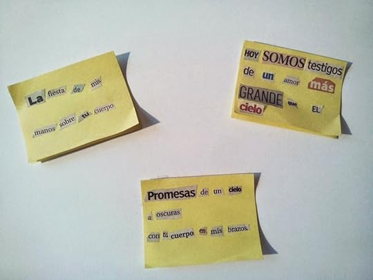 Cada vez falta menos para que Uni-versos exista en papel, y he decidido lanzarme a la piscina y abrir una preventa del libro. ¿En qué consiste? En que si lo compráis antes del 31 de marzo, os saldrá a 5€, en vez de a los 7€ a los que se venderá el libro después. Además, con el libro (que irá dedicado a quien tú quieras) incluiré un post-it único con unos versos escritos con palabras recortadas de periódicos. No habrá dos post-its iguales. Los libros los empezaré a enviar como tarde la semana del 6 de abril. Los post-its serán como estos, para que os hagáis una idea: