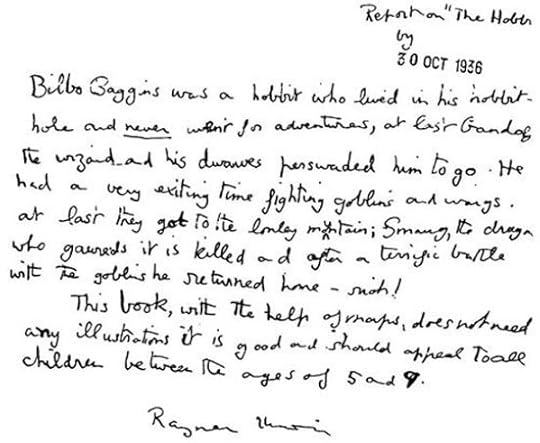 “Bilbo Baggins was a Hobbit who lived in his Hobbit hole and never went for adventures, at last Gandalf the wizard and his Dwarves persuaded him to go. He had a very exiting (sic) time fighting goblins and wargs. At last they get to the lonely mountain; Smaug, the dragon who guards it is killed and after a terrific battle with the goblins he returned home — rich! This book, with the help of maps, does not need any illustrations it is good and should appeal to all children between the ages of 5 and 9.” Rayner Unwin’s review of The Hobbit by J. R. R. Tolkien