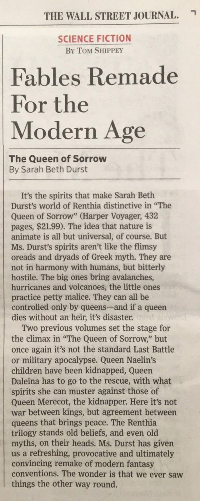 Eeeeeeep!!! My latest book, THE QUEEN OF SORROW, was reviewed in yesterday's Wall Street Journal!!! My husband randomly found the article online and ran out to 7-Eleven to buy the paper (and some milk -- we were totally out :) ). Thanks, WSJ!