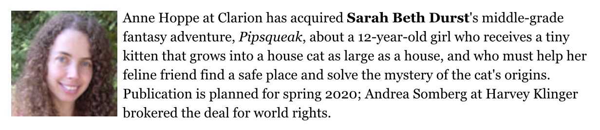 I am very, very, very thrilled to announce that I sold a new middle-grade fantasy novel, PIPSQUEAK, to my amazing editor Anne Hoppe at Clarion Books / Houghton Mifflin Harcourt, via my incredible agent Andrea Somberg!