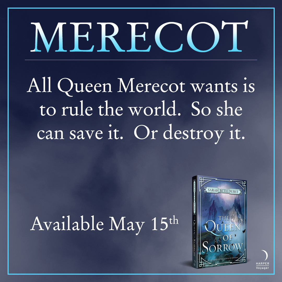 You have no idea how excited I am for readers to read Merecot's story in THE QUEEN OF SORROW. No idea. In book three, I wrap up all the storylines in The Queens of Renthia, and there's lots more Merecot! Comes out in exactly one week!!!